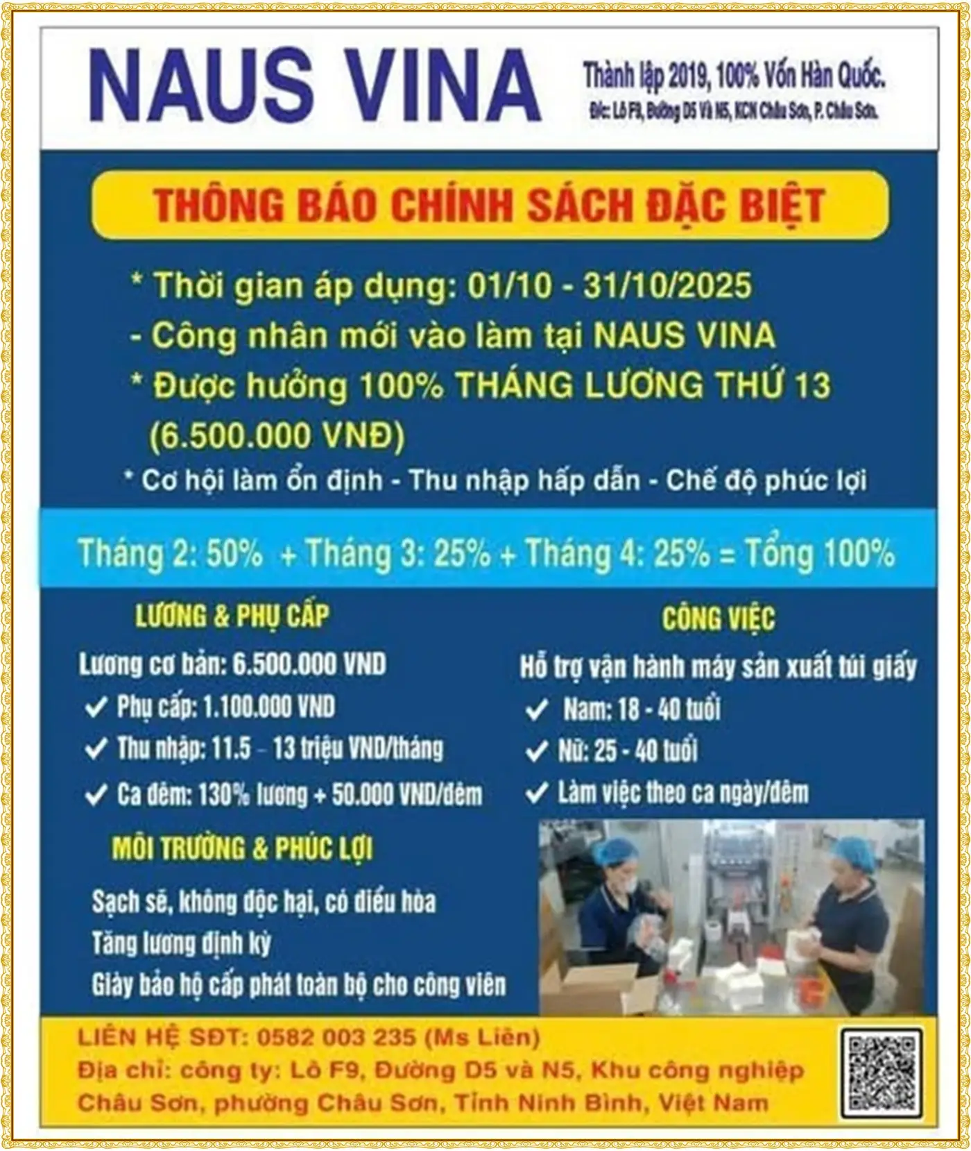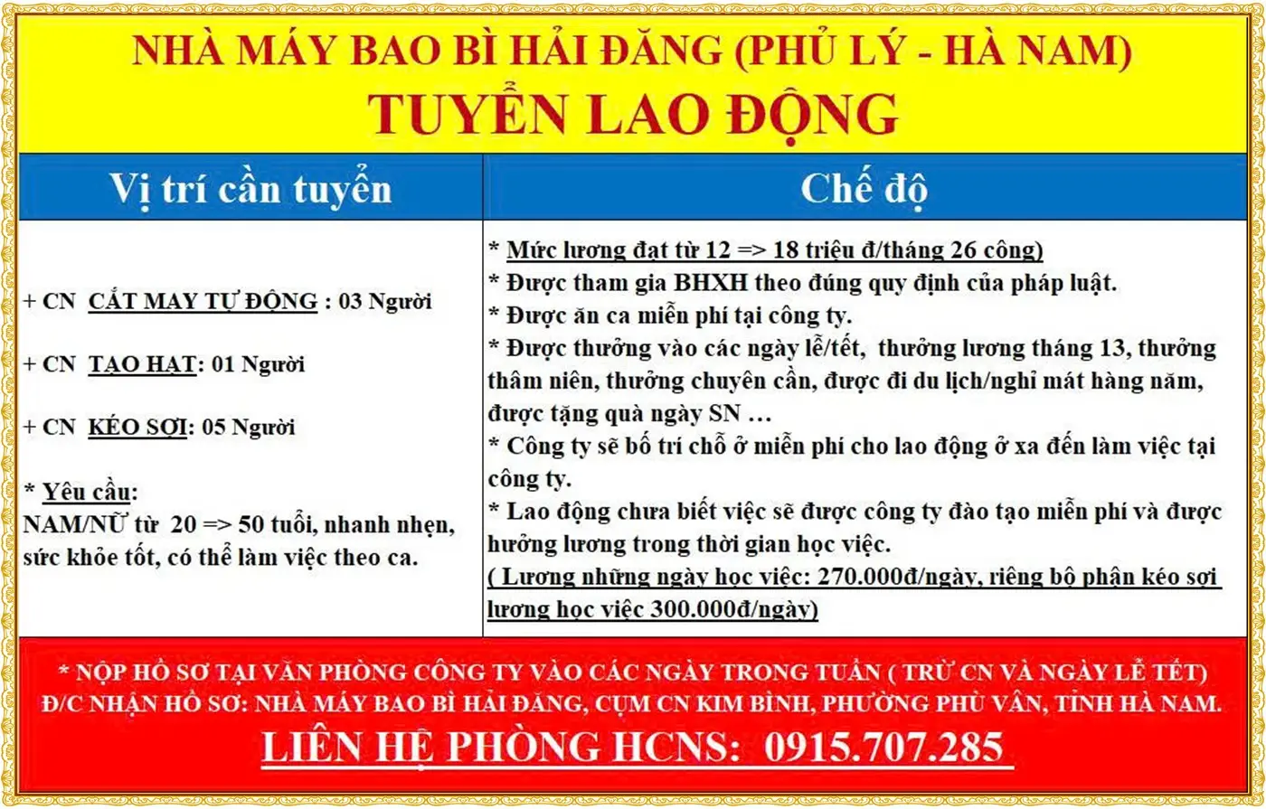 ⭐ Quyền lợi hấp dẫn: Lương khởi điểm: 6–8 triệu/tháng; Bao ăn ở đầy đủ – không lo chi phí sinh hoạt; Được đào tạo bài bản nếu chưa có tay nghề