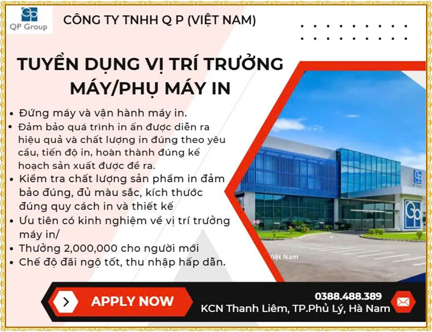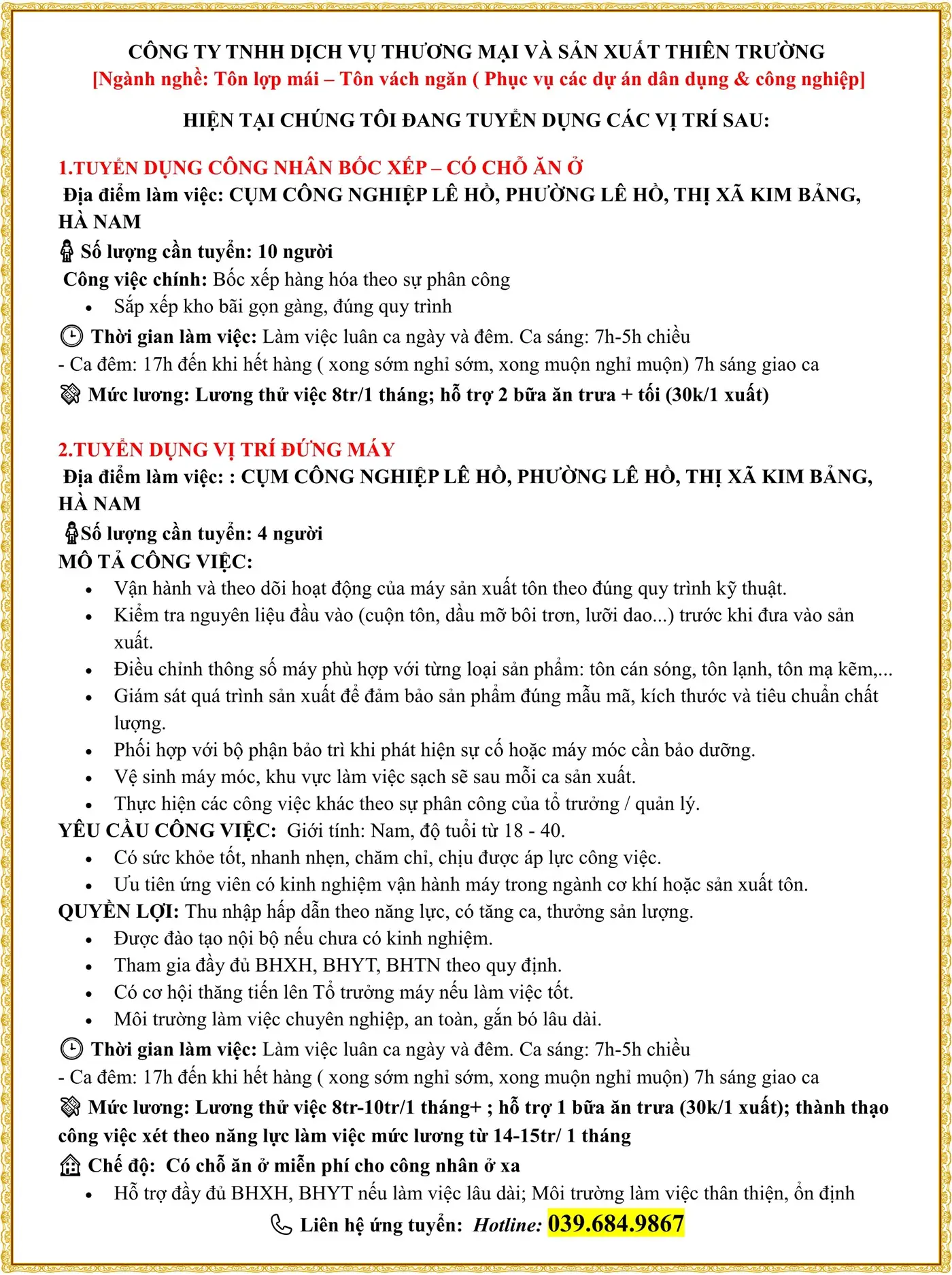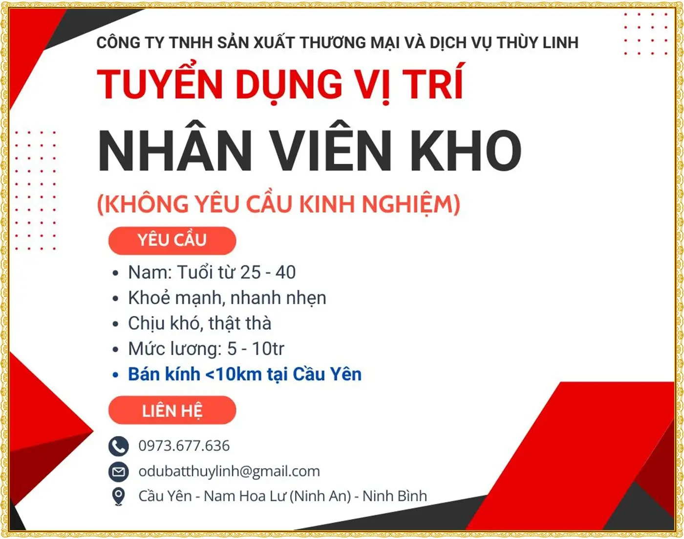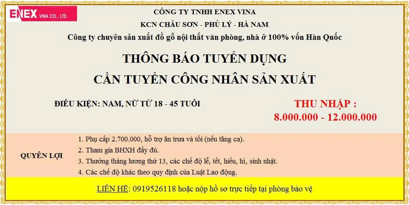 📌 Yêu cầu: Nam, có sức khỏe tốt; Chăm chỉ, nhanh nhẹn, mong muốn làm việc ổn định lâu dài